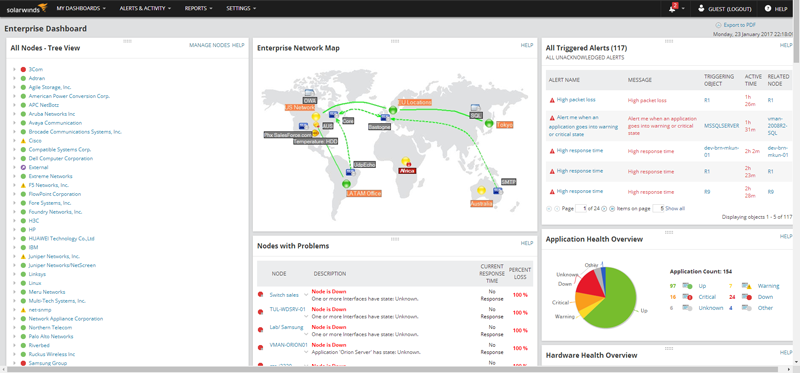 SolarWinds Orion Network Performance Monitor(NPM)是集网络监测、设备性能维护管理、故障监控、网络实时流量监控和历史数据统计、汇总和历史数据分析等功能于一体的网络管理系统。